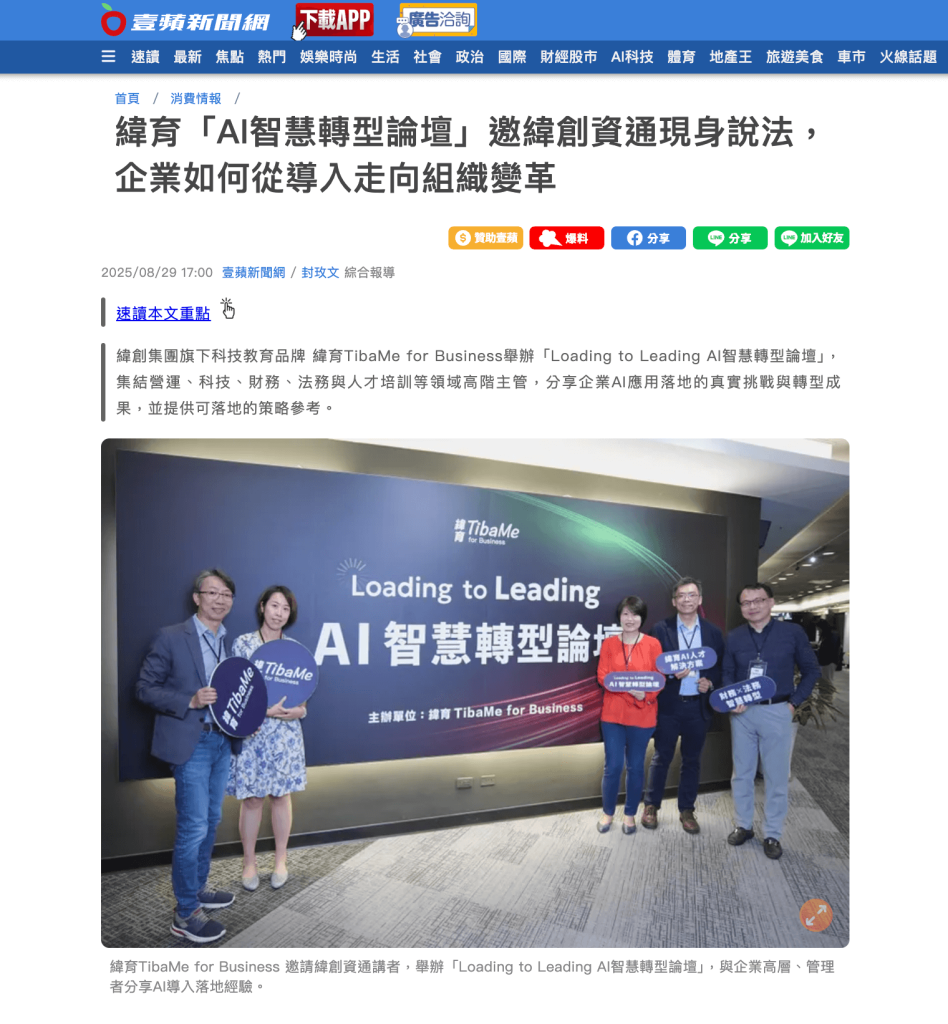 緯創集團旗下科技教育品牌 緯育TibaMe for Business舉辦「Loading to Leading AI智慧轉型論壇」,集結營運、科技、財務、法務與人才培訓等領域高階主管,分享企業AI應用落地的真實挑戰與轉型成果,並提供可落地的策略參考。