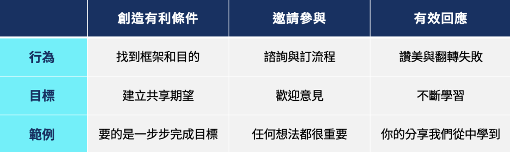 - 有效回應:謝謝對方的回饋,多給予實質的讚美;面對失敗的時候也要翻轉對於失敗不好的想法,為什麼要這麼作呢?目標就是要不斷地學習。你可以這麼說:「謝謝你的分享我們從中學到了什麼…接下來我們可以如何…」
