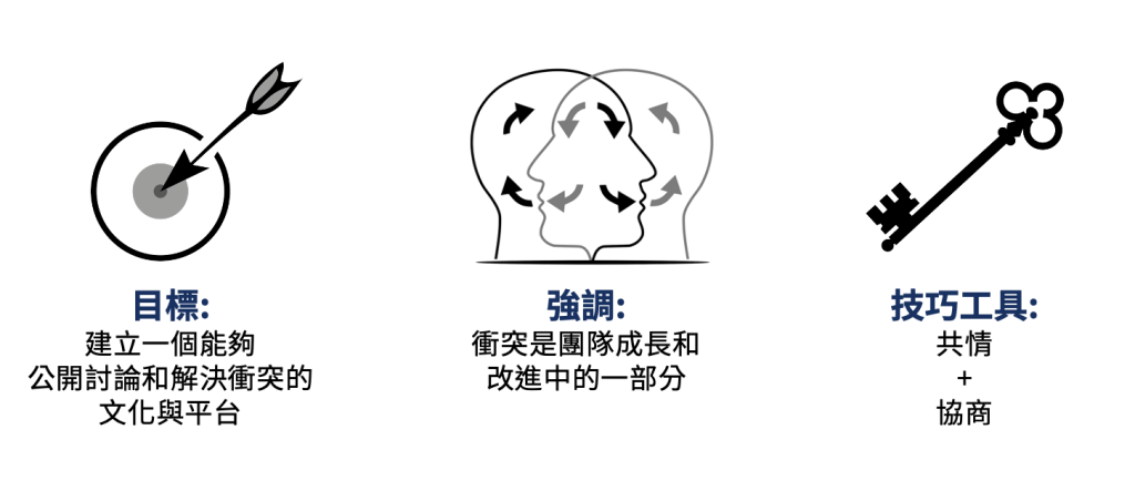 ① 團隊如同家庭/婚姻/愛情,只要具有良好的關係,就會彼此願意溝通、把話說出來。在團隊中,彼此要雙向溝通,共同建立一個能夠公開討論問題、解決衝突的文化與平台,並強調衝突能夠幫助團隊成長和改進。