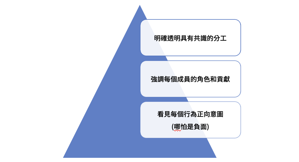 就像家庭關係或戀愛關係,要先了解關係成員的現況和角色,建立彼此的規則和條件,而不需要一味討好迎合。新成員進來團隊時,先讓他了解團隊規則,如成員做得不好、發生衝突時,記得用剛剛的三步驟來溝通。