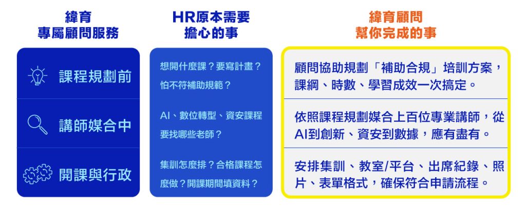 - 課程顧問服務 — 對齊組織發展與能力升級目標,量身打造完整培訓規劃方案