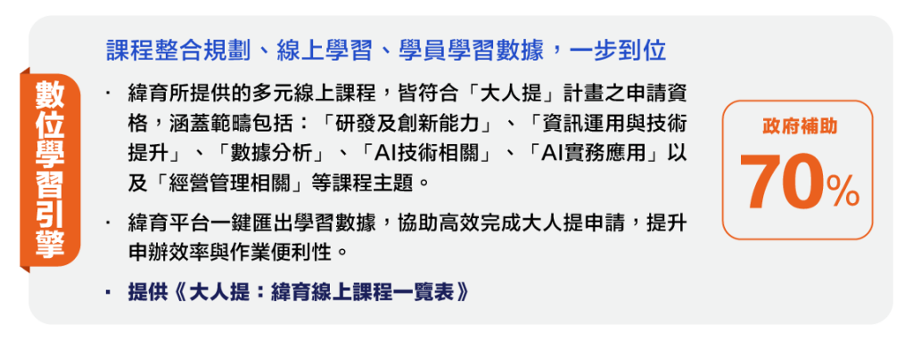 緯育 TibaMe for Business 提供超過 100 堂高實用性的數位課程,涵蓋 AI 工具應用、數據分析、Excel & Power BI、數位自動化、資安素養、ESG 等重點主題。企業可依據職能需求指派課程,平台自動記錄學習時數與成效,協助 HR 快速完成補助申請與核銷所需資料,符合大人提對數位學習的規範。