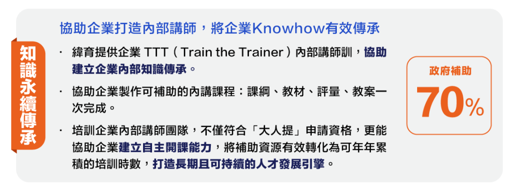 緯育協助企業打造內講制度,提供完整 TTT(Train the Trainer)講師訓練專班,並輔導轉化為具補助效益的數位教材。從教案設計、教材製作到評量規劃,全程專人協助,使企業知識內化為可重複使用的教學資源。每家企業最多可補助 8 名內講參訓,最高補助比例達 70%,讓培訓不只當年度有效,更為未來建立永續學習體系。