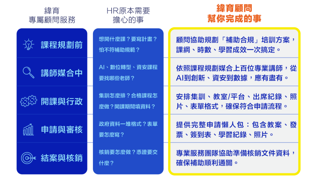 - 全程顧問服務 — 從課程規劃、申請文件到核銷作業,提供專人協助與完整交付